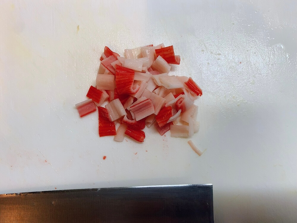 カニ風味かまぼこを横4等分に切って、ほぐしておきましょう。