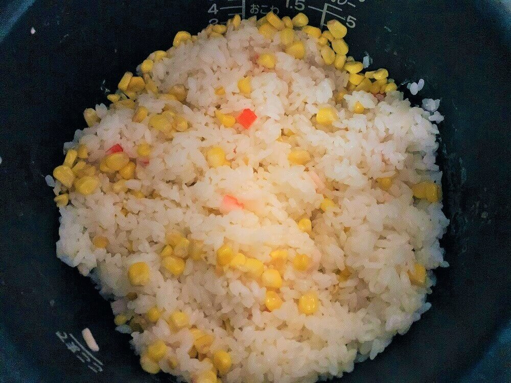 ごはんが炊き上がったら、とうもろこしの芯を取り除いて、炒めたコーンとカニ風味かまぼこを加えて混ぜ合わせましょう。