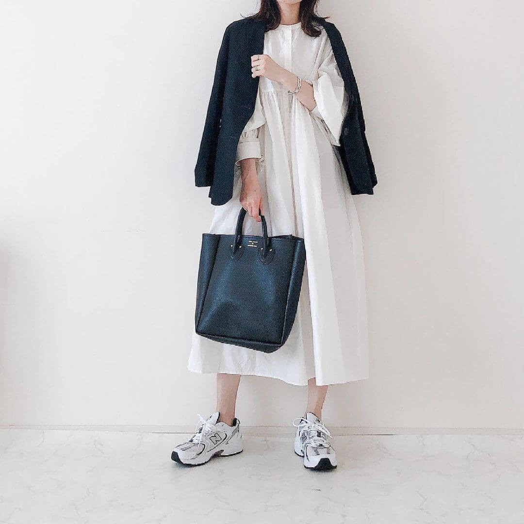 ふんわりとした白いワンピースをメインにした、大人可愛いコーディネート。