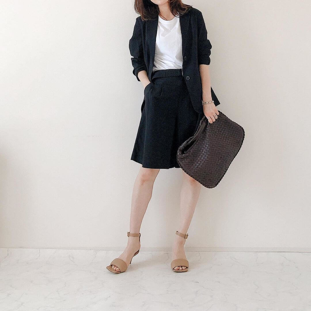 黒のリネンジャケットを羽織ったことで、全体がグッと引き締まったバランスに。
