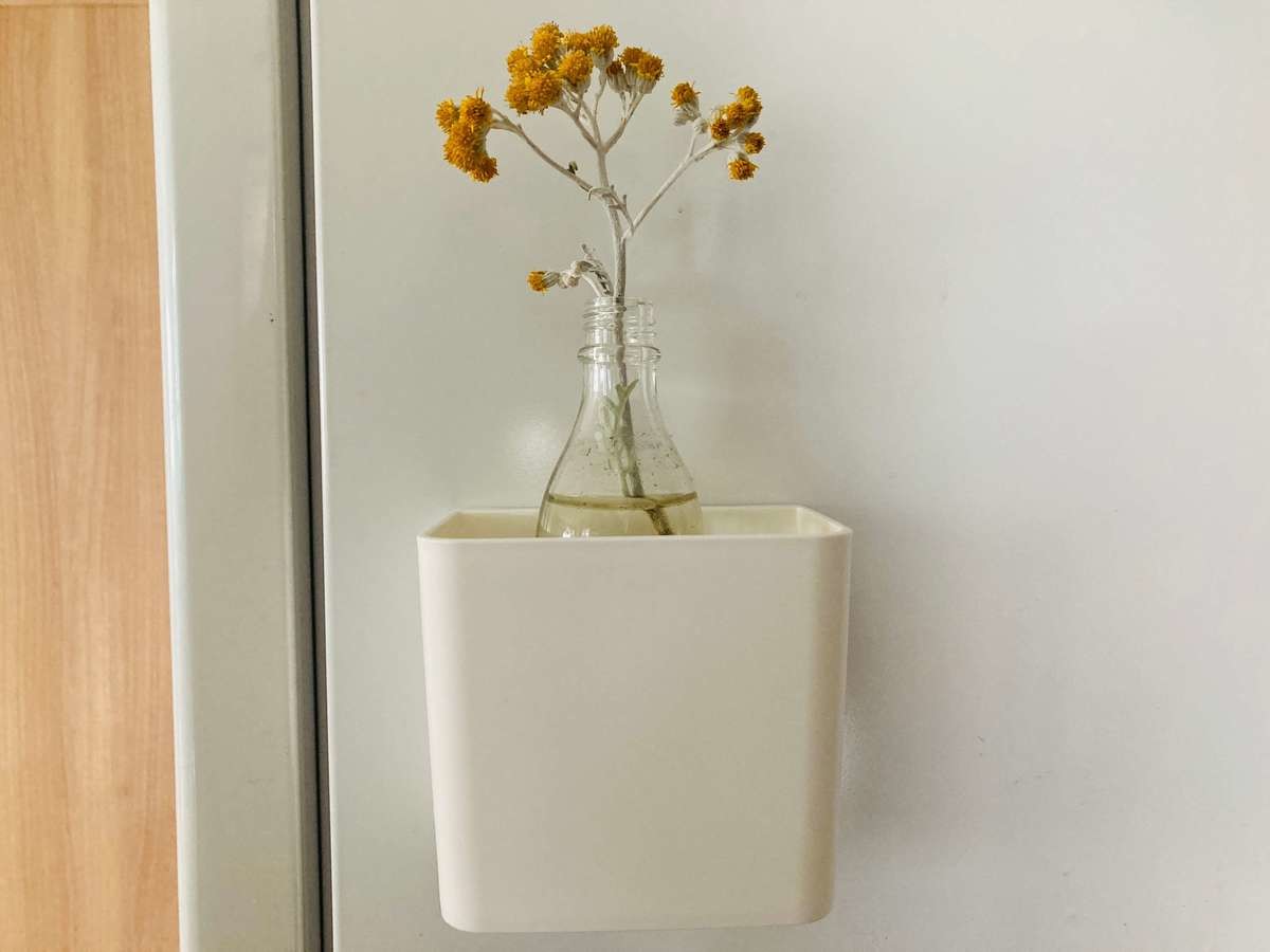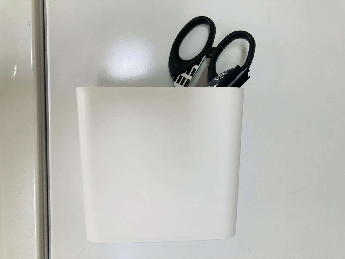シンプルデザインで、冷蔵庫やパネルにマグネットで簡単に取り付けできる収納ケースなんです。
