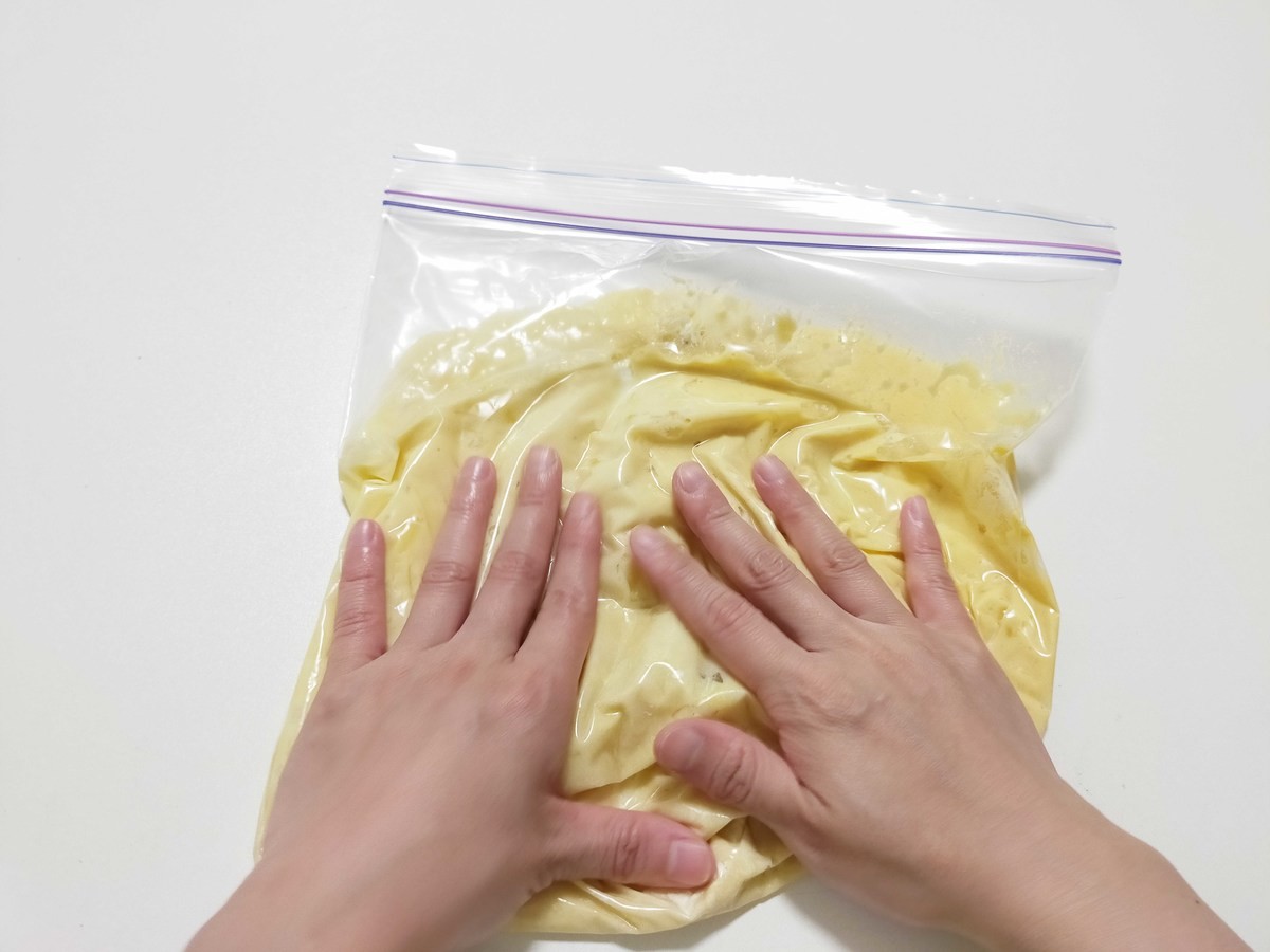 ヨーグルト・たまご・ピザチーズ・砂糖を密閉式の保存袋に入れてよくもみましょう。混ざったら、ホットケーキミックスを加えてさらにもみ混ぜます。
