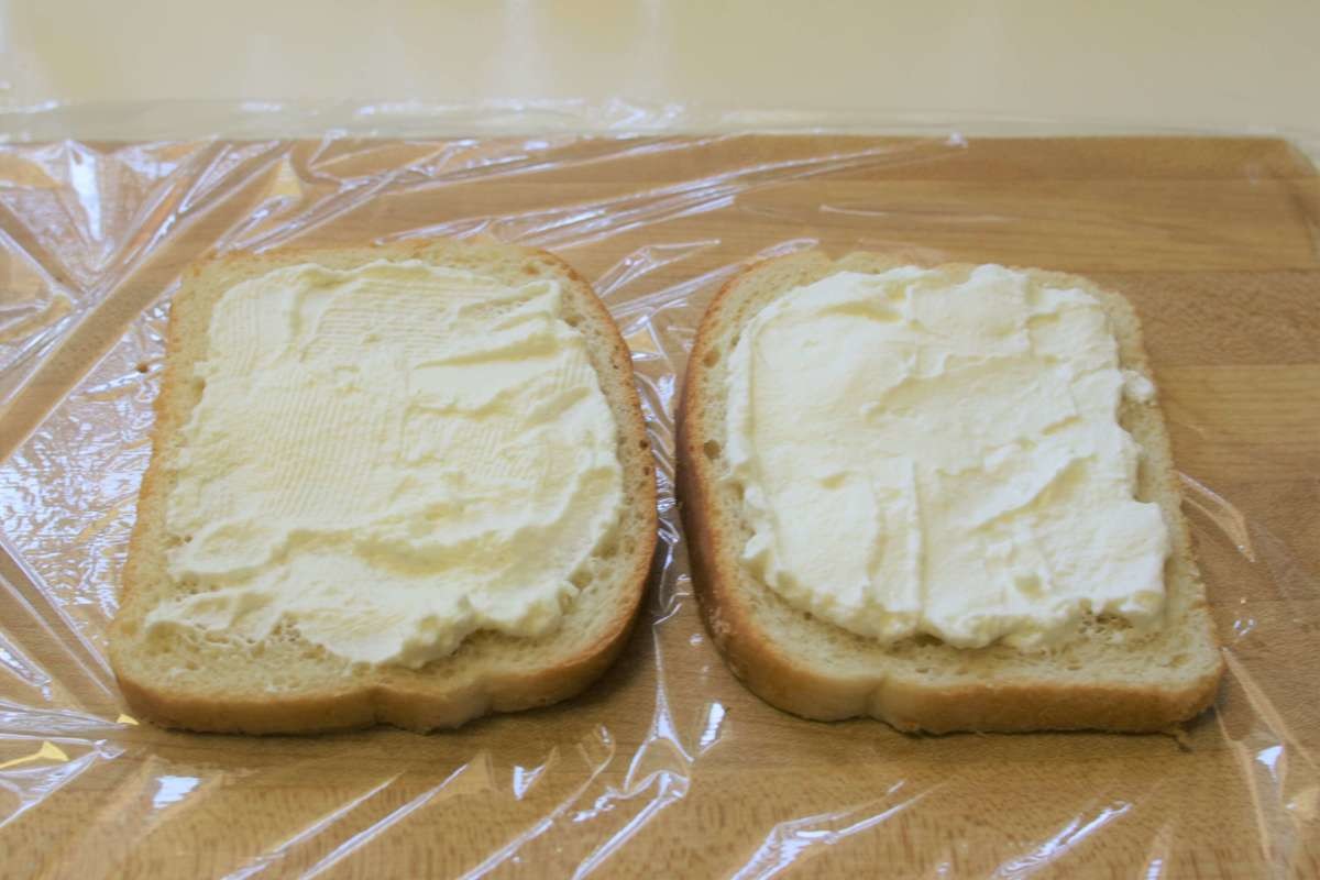 ヨーグルトを塗った食パンを③の上に乗せて手で軽く上から押さえ、ラップをぴっしりと巻きます。