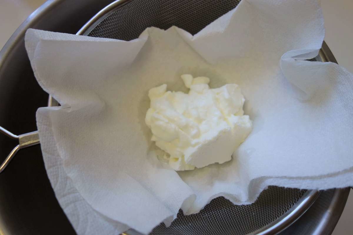 ボウルにザルを重ねてキッチンペーパーを敷き、そこにヨーグルトを入れて一晩しっかりと水切りします。