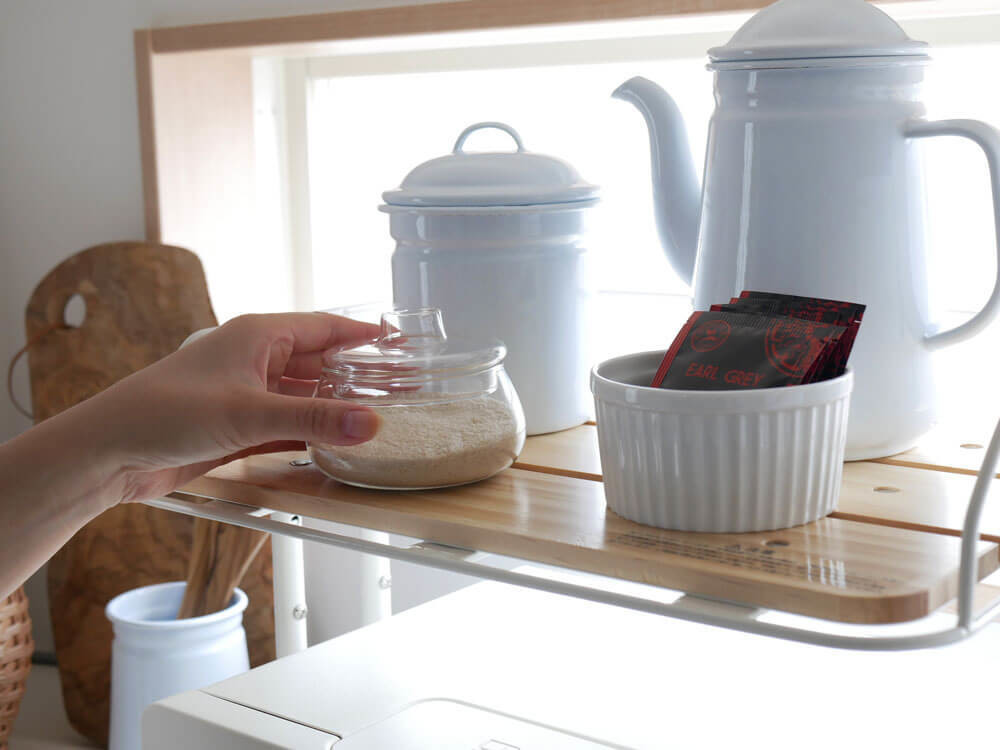 でも、トースターの上の空間にちょっとした棚があれば、食パンやシリアル、アルミホイルや毎日飲む紅茶やコーヒーなどをすぐに手に取れる場所に置いておけます。