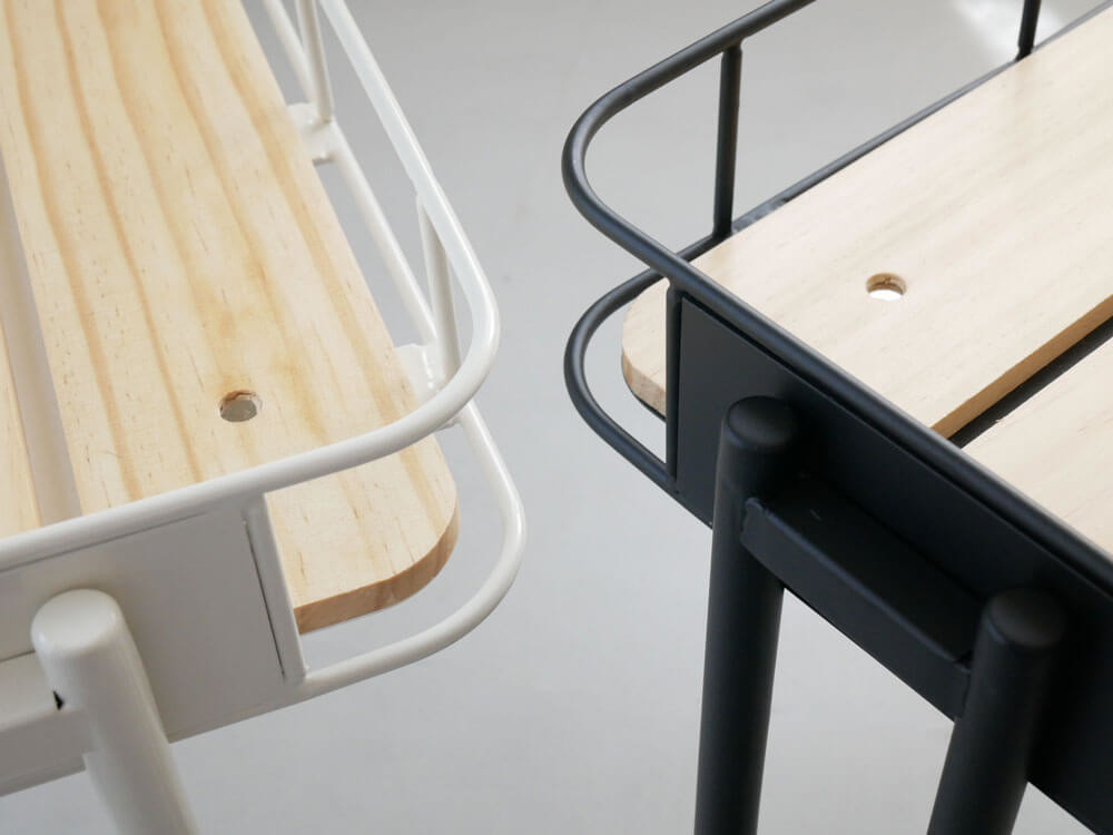 フレームの素材は、粉体塗装されたスチール。防錆効果や衝撃、傷に強い効果があり、粉体塗料の細やかさがナチュラルな質感をも生み出しています。