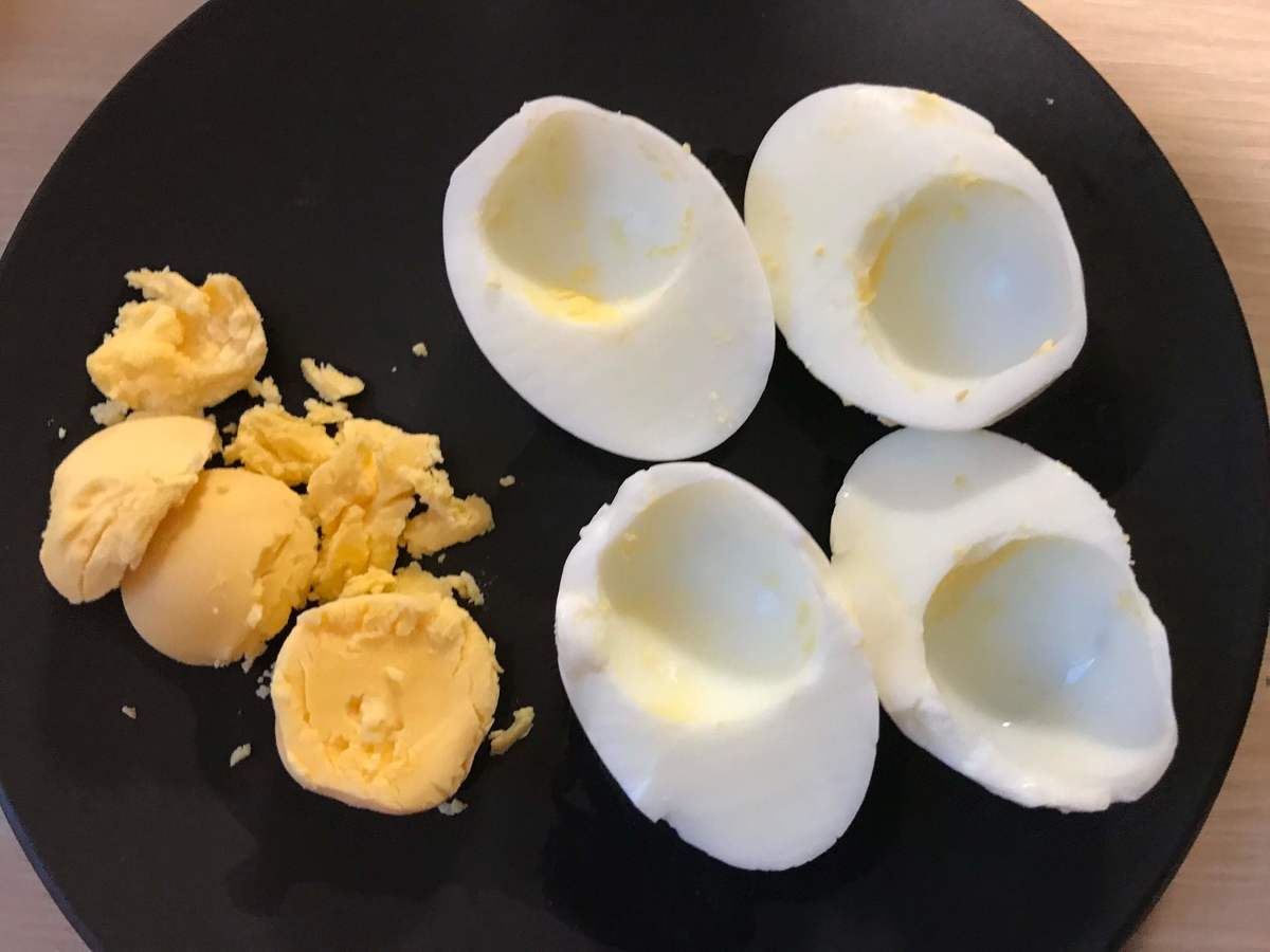 スプーンで黄身をくりぬいて、分けておきます。