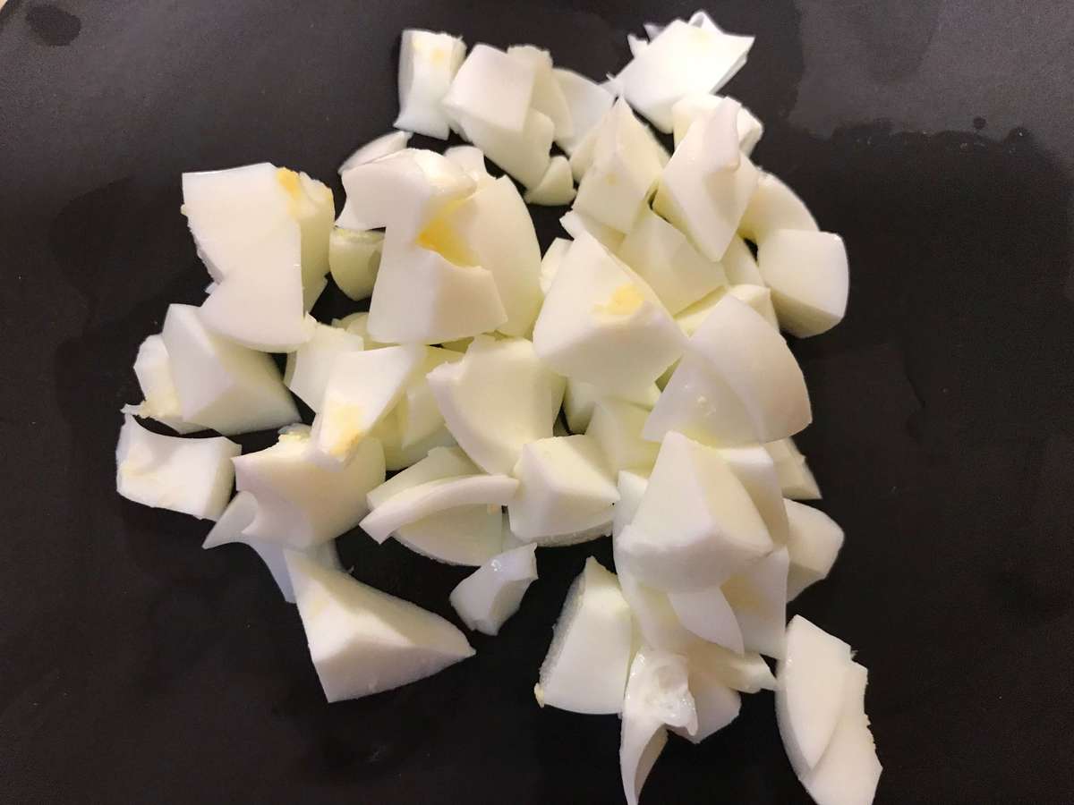 たまごサンドの食感のかなめである「白身」はざく切りにします。せっかくなので、かなり大きめに切ってみました。