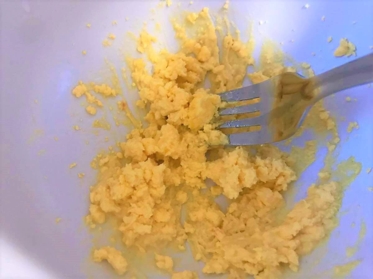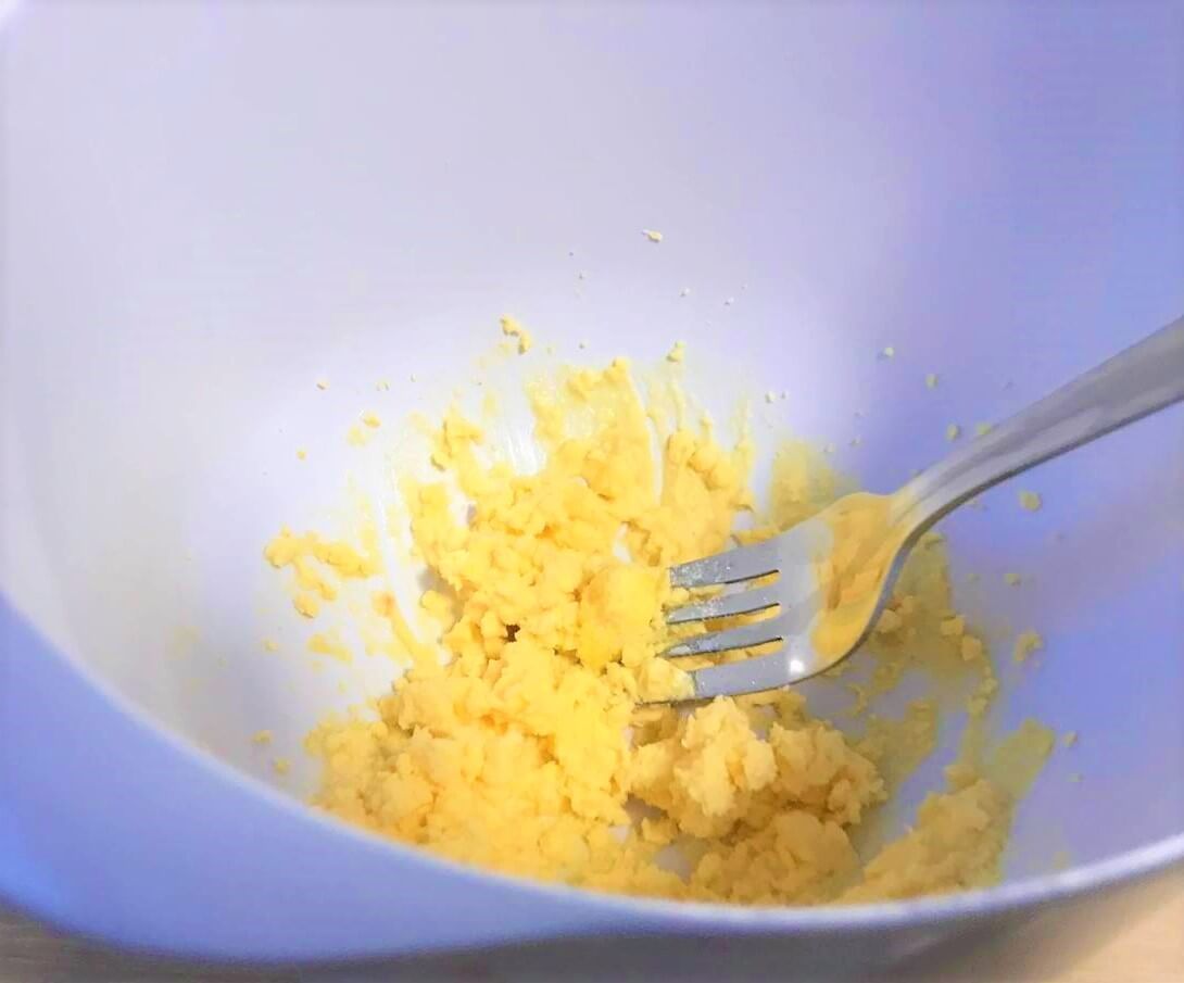 ボウルに黄身を入れて、ヘラやフォークで細かくつぶします。