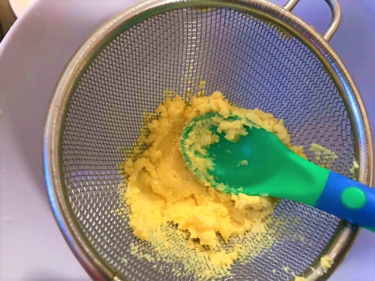 よく練ったら、ザルや茶こしでこして、なめらかに仕上げます。