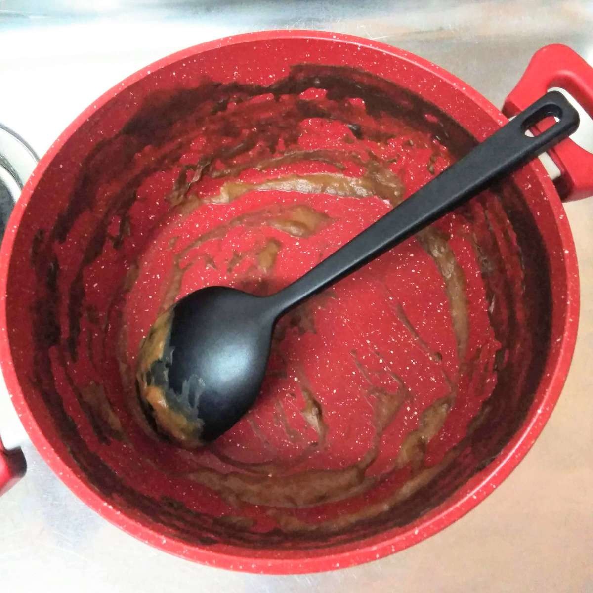 めちゃめちゃ鍋にこびり付いています。(これ洗うの憂鬱ですよねぇ……。)