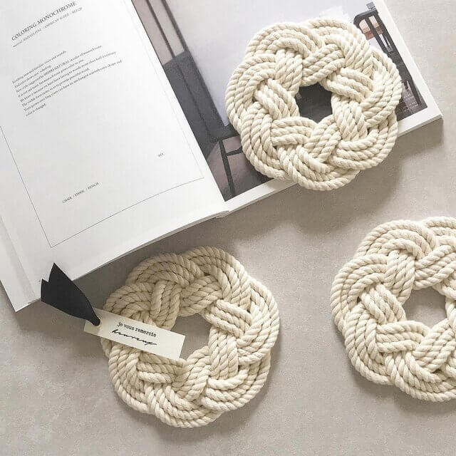 韓国っぽな雰囲気で、シンプルだけどおしゃれ見えする「マクラメコースター」です。実は今、マクラメ雑貨がSNSでも人気!ナチュラルな色味がどんなインテリアにもなじみます。自分用やちょっとした手土産としても喜ばれそうですね。