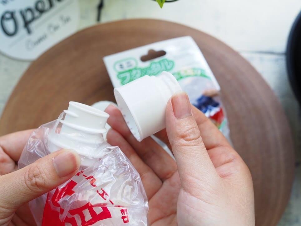 取り付け方も簡単で、袋にキャップが入る程度の穴をカットしてから上下パーツをくるくる回転させ、袋とキャップを固定するだけ♪
