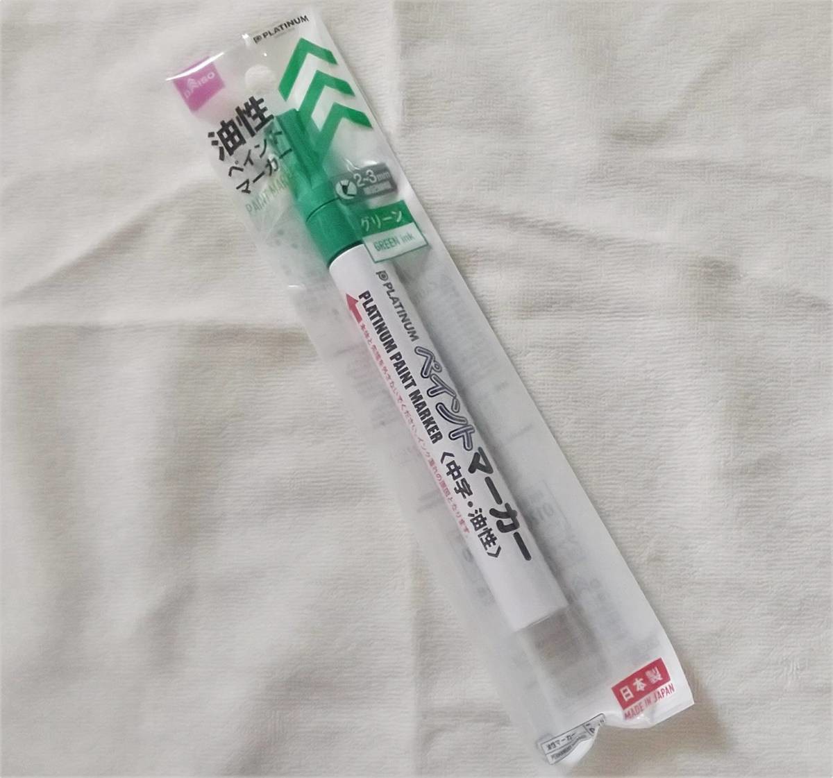 文房具店やホームセンターはもちろん、100均の大型店などで、ほぼゲットできる「緑色の油性ペン」(写真のペンはダイソーの大型店で購入しました)。