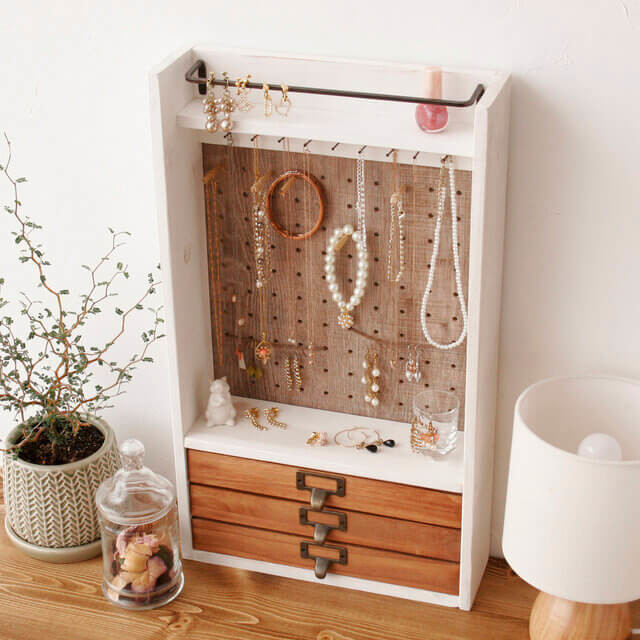 ナチュラル&ホワイトカラーが可愛い「引出し3段付きアクセサリー入れ」です。とにかくアクセサリーが沢山ある!という方にぴったりの作品です。ピアスやネックレス、ブレスレットはもちろん、ネイルポリッシュなども見せる収納でおしゃれに飾れますよ!