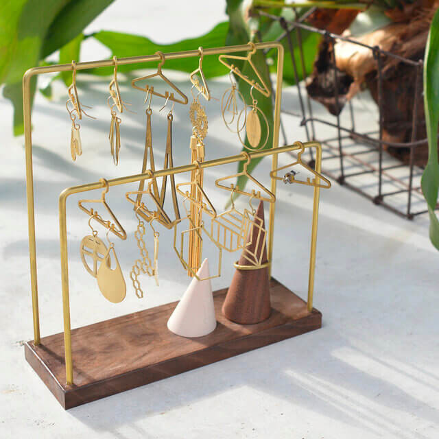 お洋服をハンガーに掛けるように、アクセサリーもハンガーに掛けて収納できる、ユニークな作品です。おしゃれに見せる収納ができるので、インテリアとしても映えますよ!下には、リングを置いて飾るのもいいですね。