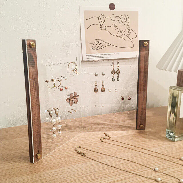 クリア×ウッド素材が目を惹く、ピアスを見せて収納できる「本型ピアススタンド」です。ピアスをたっぷりと収納でき、お店のディスプレイのような雰囲気が好きな方にぴったりの作品です。