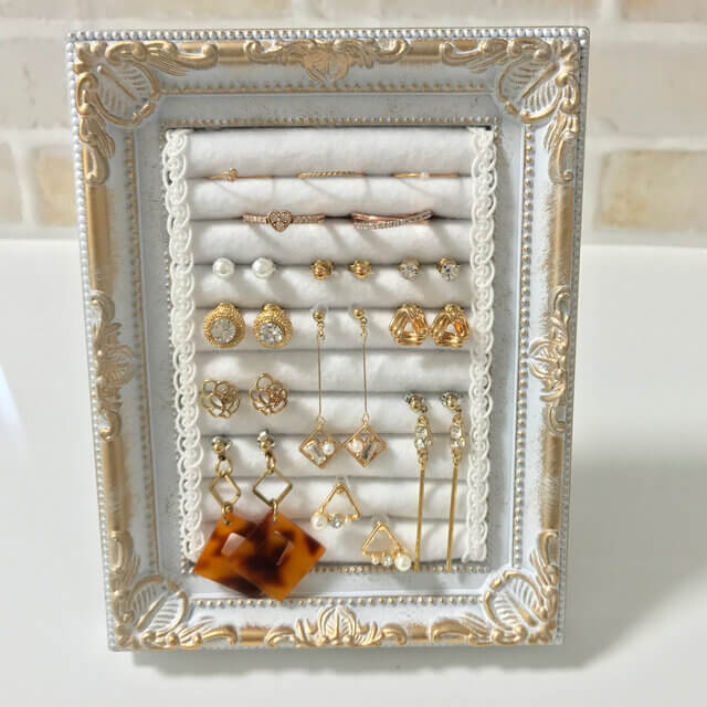 こちらの作品は、ピアスやリングなどを収納できます。小さめのサイズですが、ゴールド×ホワイトのアンティーク調で上品でリッチな印象です。写真フレームのように、ちょっとしたスペースに飾れる手軽さが人気の秘密です。