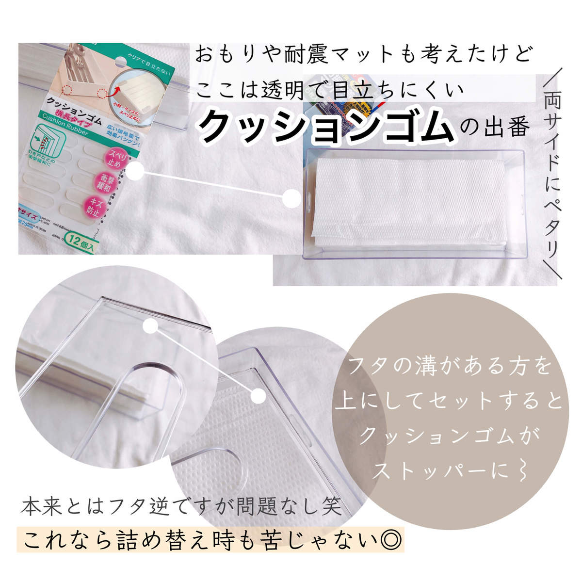 フタを抑える形で、おもりを乗せたり耐震マットを使うことも考えましたが、透明で目立ちにくい「クッションゴム」を使用することに。