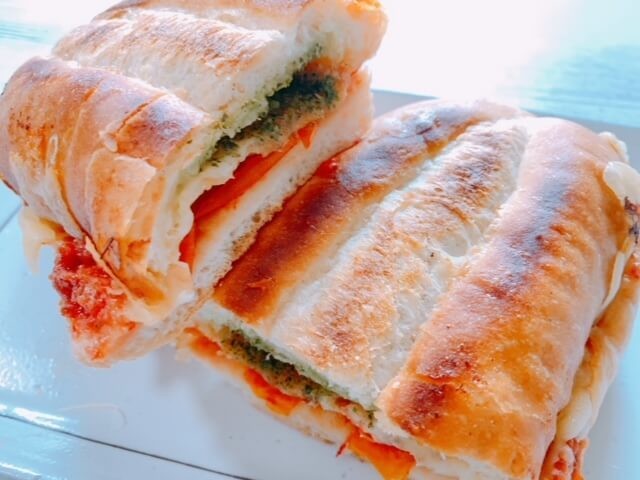 バジルとチェリートマトの酸味が抜群の取り合わせのマルゲリータピザサンド。バジルの甘くて爽やかな香りが決め手になっています。