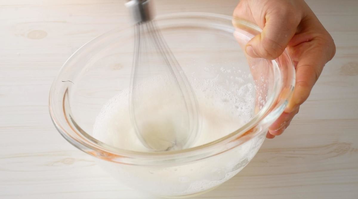 ボウルに卵白だけ入れて塩を加えたら、ツノがピンっと立つまで泡立て器で泡立てましょう。塩を入れることで泡立ちがすごくよくなります!