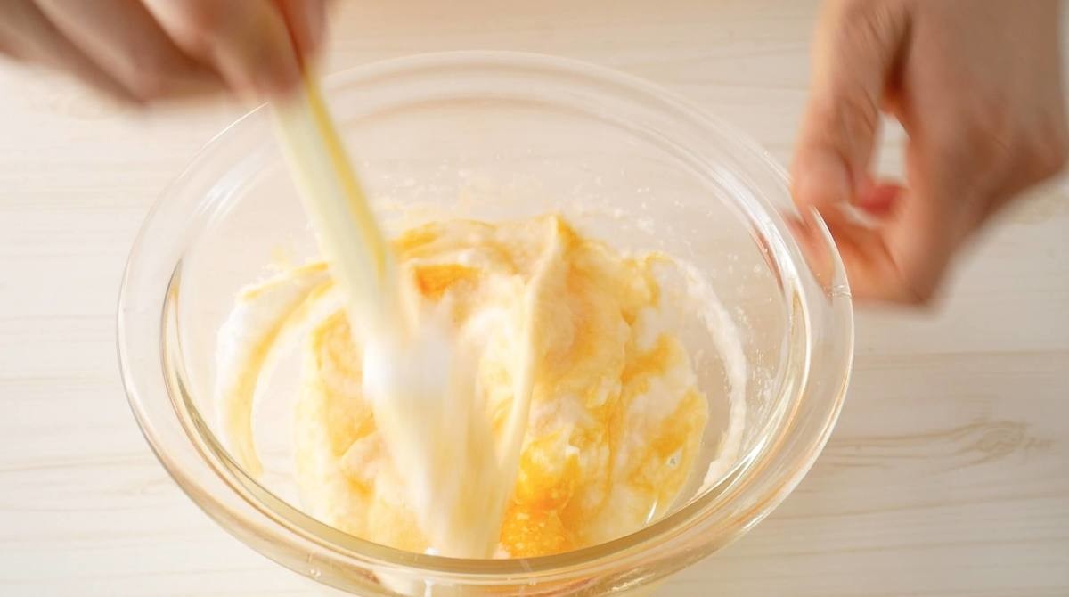 卵黄を加えたら、泡をつぶさないようにヘラでふわっと混ぜましょう。