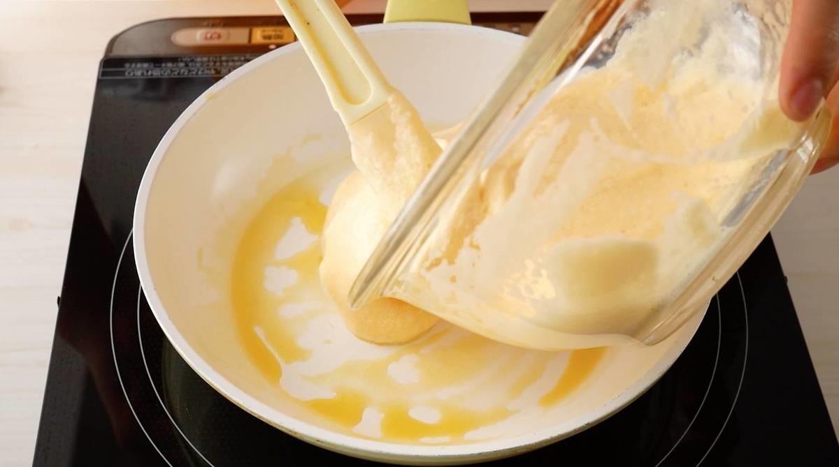 温めたフライパンにバターをひき、生地を流し入れましょう。