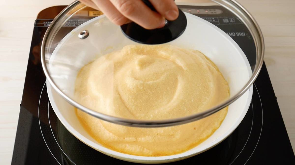 流し入れたら蓋をして、弱火で「表面がフツフツするまで」加熱します。ここではじっくり焼くことがポイントです。