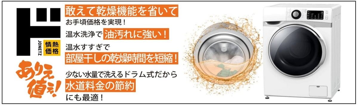 7kgドラム式洗濯機は、ドラム式洗濯機を持っていても「乾燥機能をあまり使っていない」というお客さまの声を受けて、敢えて乾燥機能を省いた設計にして“ありえ値ぇ!”お手頃価格を実現した当社のPB製品では初登場となる“ドラム式洗濯機”です。