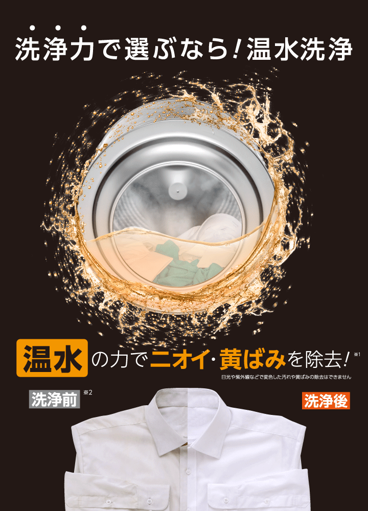 本製品内に専用の温水ヒーターを搭載しており、水を温めることで洗剤の洗浄効果を最大限に引き出し、ニオイの原因菌や皮脂汚れを除去します。さらに繊維に染み付いた黄ばみもスッキリと洗い流します。