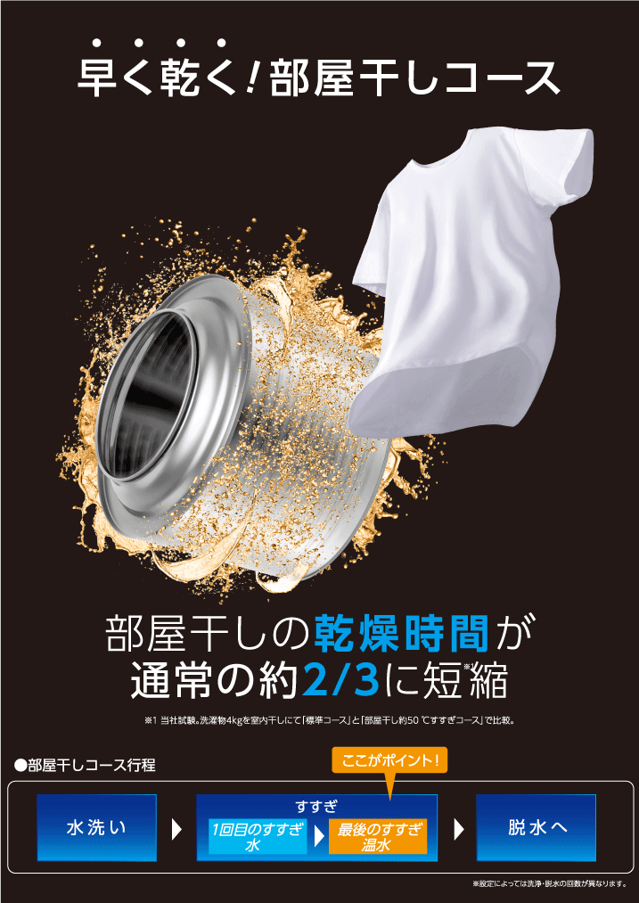 ※2 洗濯物4kgを部屋干しでの乾燥時間を「標準コース(水温17℃)」と、「部屋干し約50℃すすぎコース」で比較。