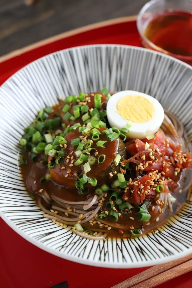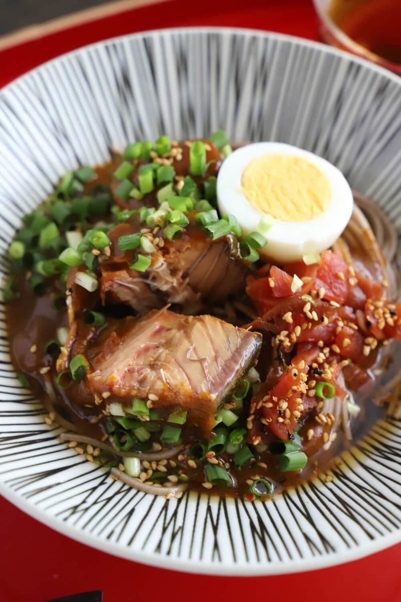 蕎麦は茹でて水で締めて器に入れ、希釈して温めた麺つゆをかけ、温めた鯖缶カレーをのせ、簡単鯖缶カレー蕎麦の出来上がり!