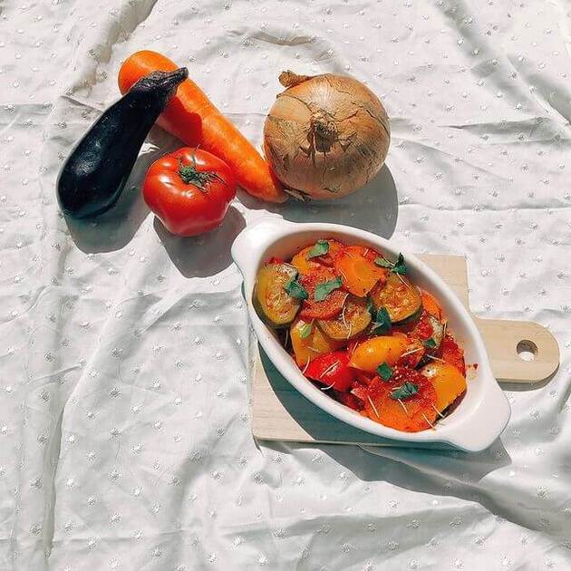 これからの季節にぴったりのレンジでできるラタトゥイユ。野菜を切ったら耐熱容器に入れて、電子レンジで8分熱して出来上がり。素材の味が凝縮されて満足感たっぷり。(調理時間:15分)