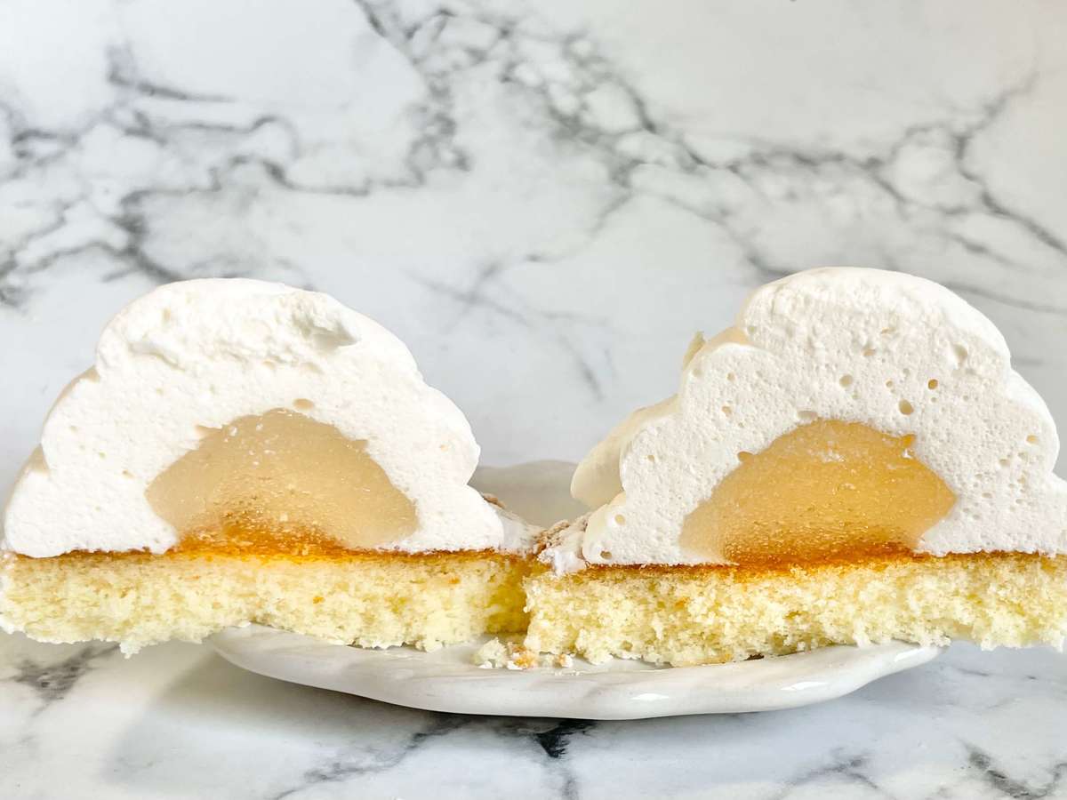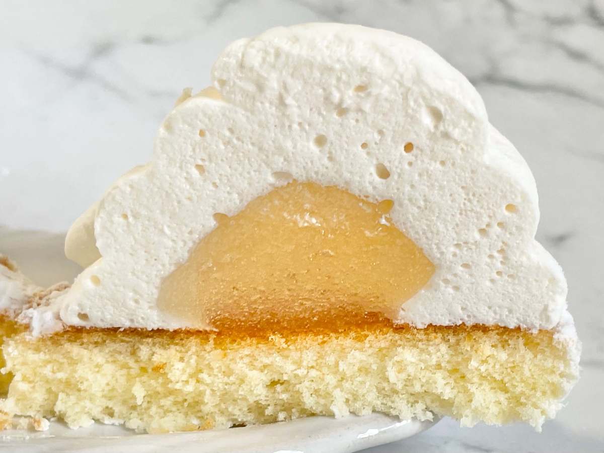 スポンジ生地の上に酸味のあるレモンジュレをのせ、レモンマシュマロで覆ったマシュマロケーキだそう。