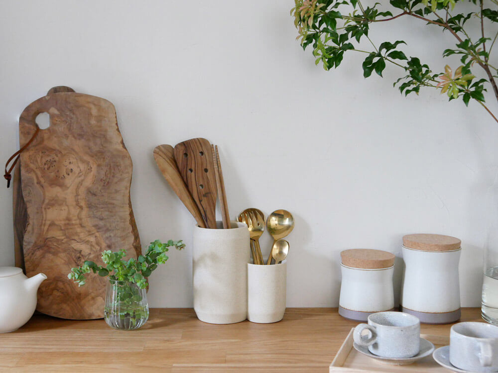 毎日の出番が多いツール類をすぐ手に取れるようにスタンバイさせておけるオーガナイザー役の「Kitchen ツールスタンド COMBO」。 口の部分がすぼまっているため、雑多な印象になりがちなツールが広がらずにスッキリと見えるのが嬉しいですね。