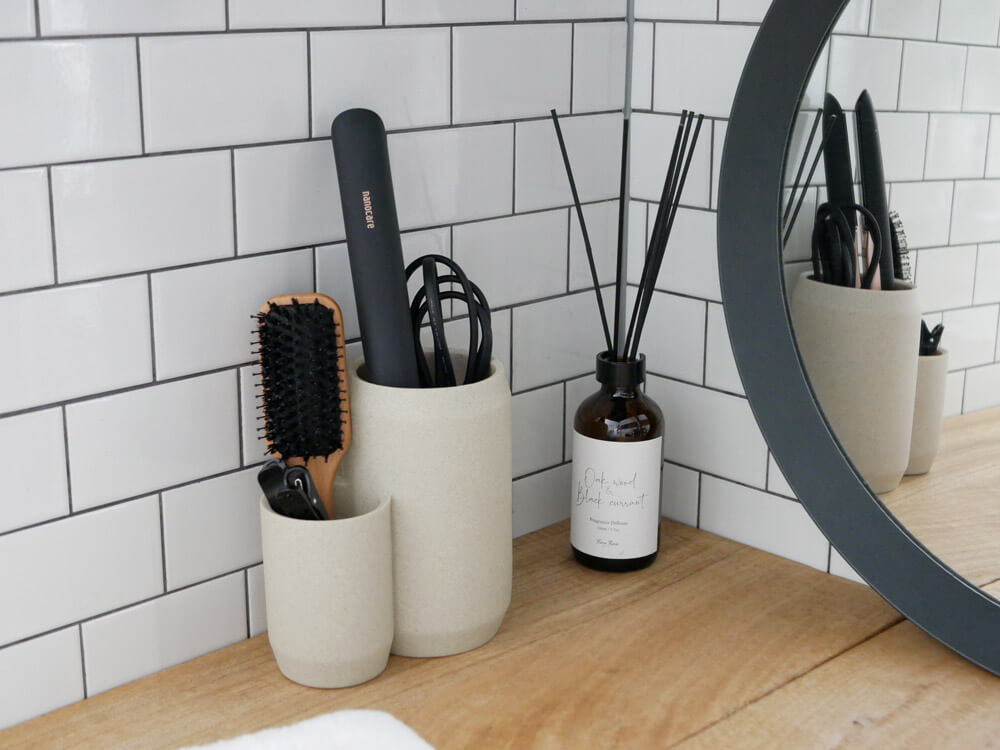パウダールームではヘアアイロンやブラシ類、小さい方にはヘアクリップなど。リビングでは、リモコンやペン類などのステーショナリー、また、DIY用の工具類などの整理にも。