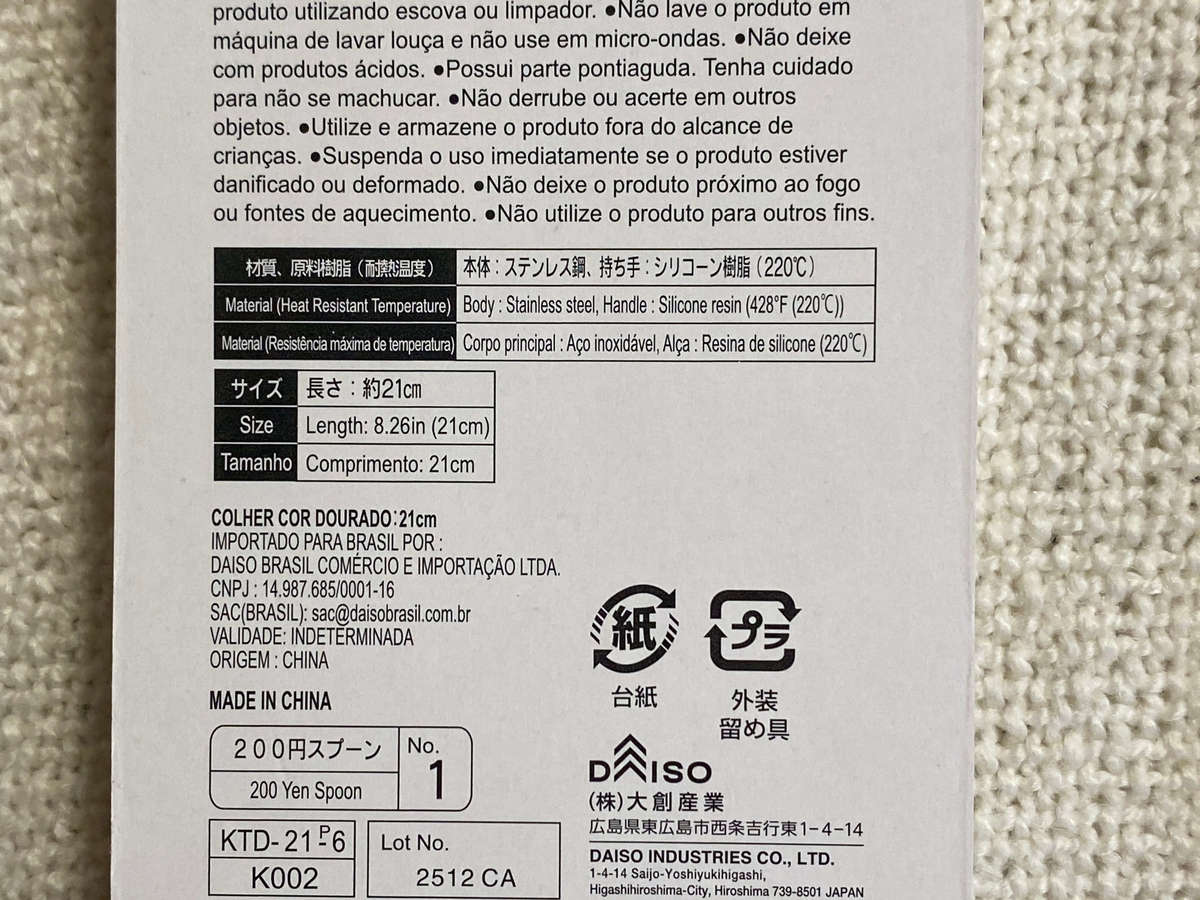 本体はステンレス、持ち手部分はシリコーン樹脂。耐熱温度は220℃ですが、食器洗浄機の使用はNG。ちなみに本家クチポールは食洗機対応とのこと。ダイソー製は取り扱いに注意が必要です。