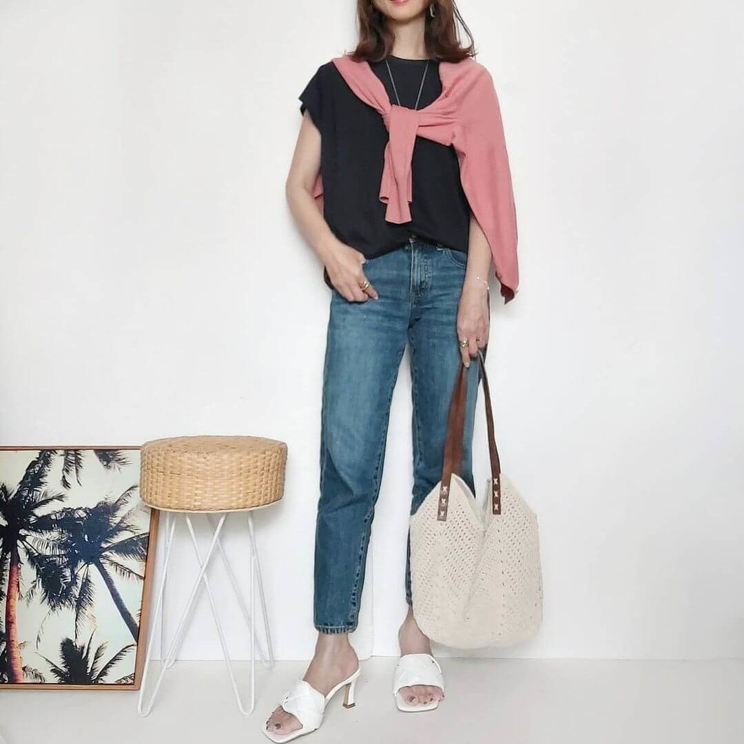 ピンク色のカーディガンを無造作に肩掛けして、シンプルながらも旬なおしゃれが完成です。