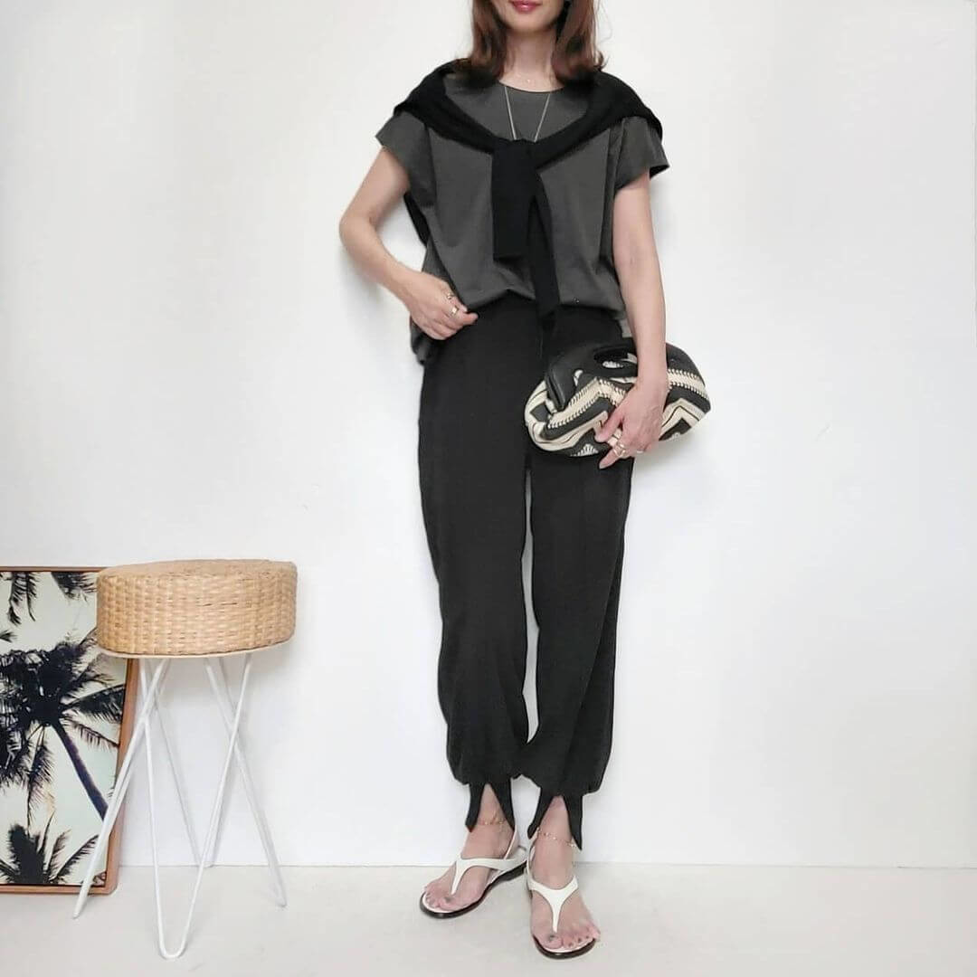 黒いバッグとサンダルが全体をキリッと引き締めて、コントラストをつけた装いが出来上がり。