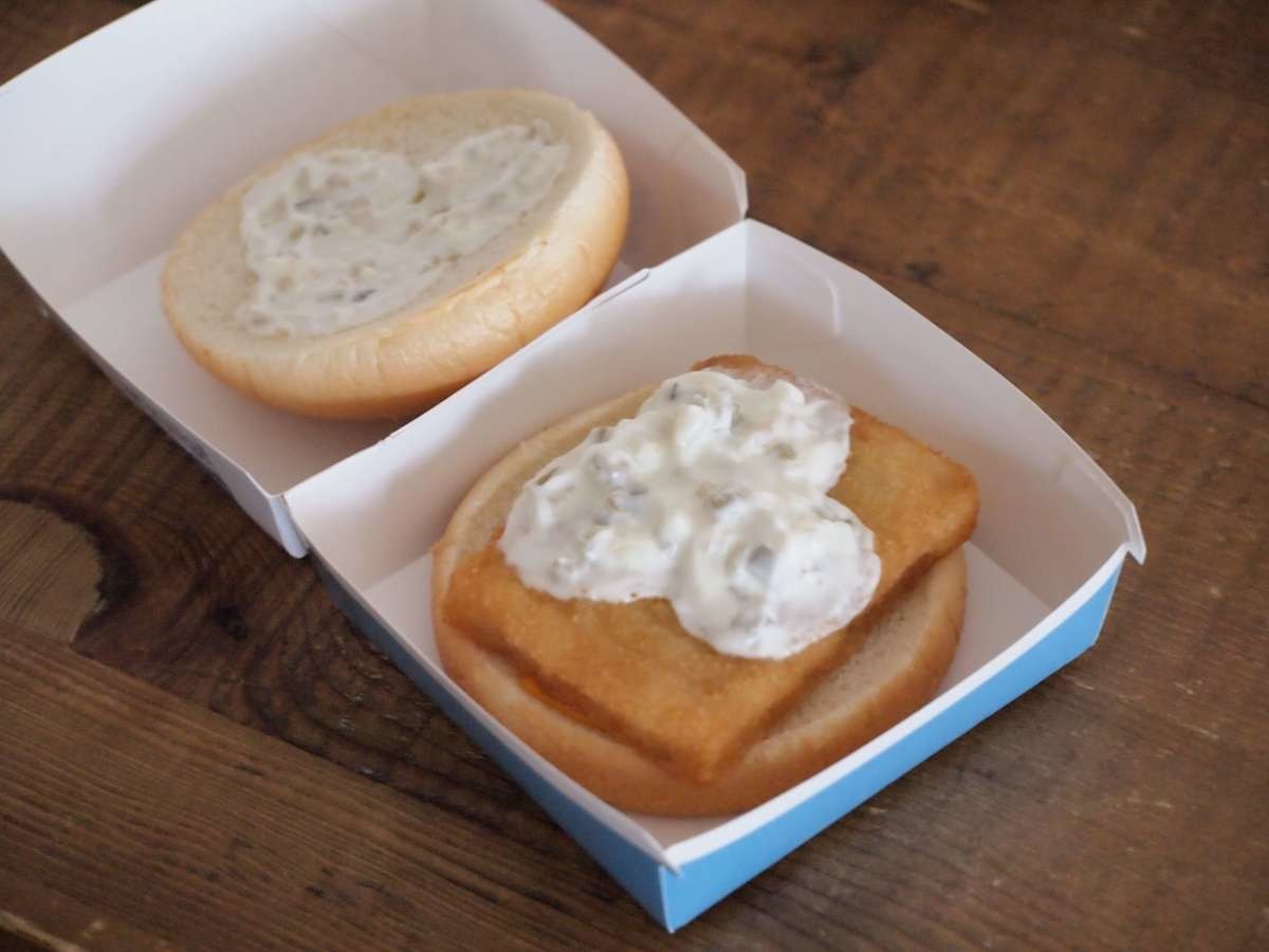 まずは蓋を開け、上にのっているバンズをはずします。タルタルソースたっぷりですね。