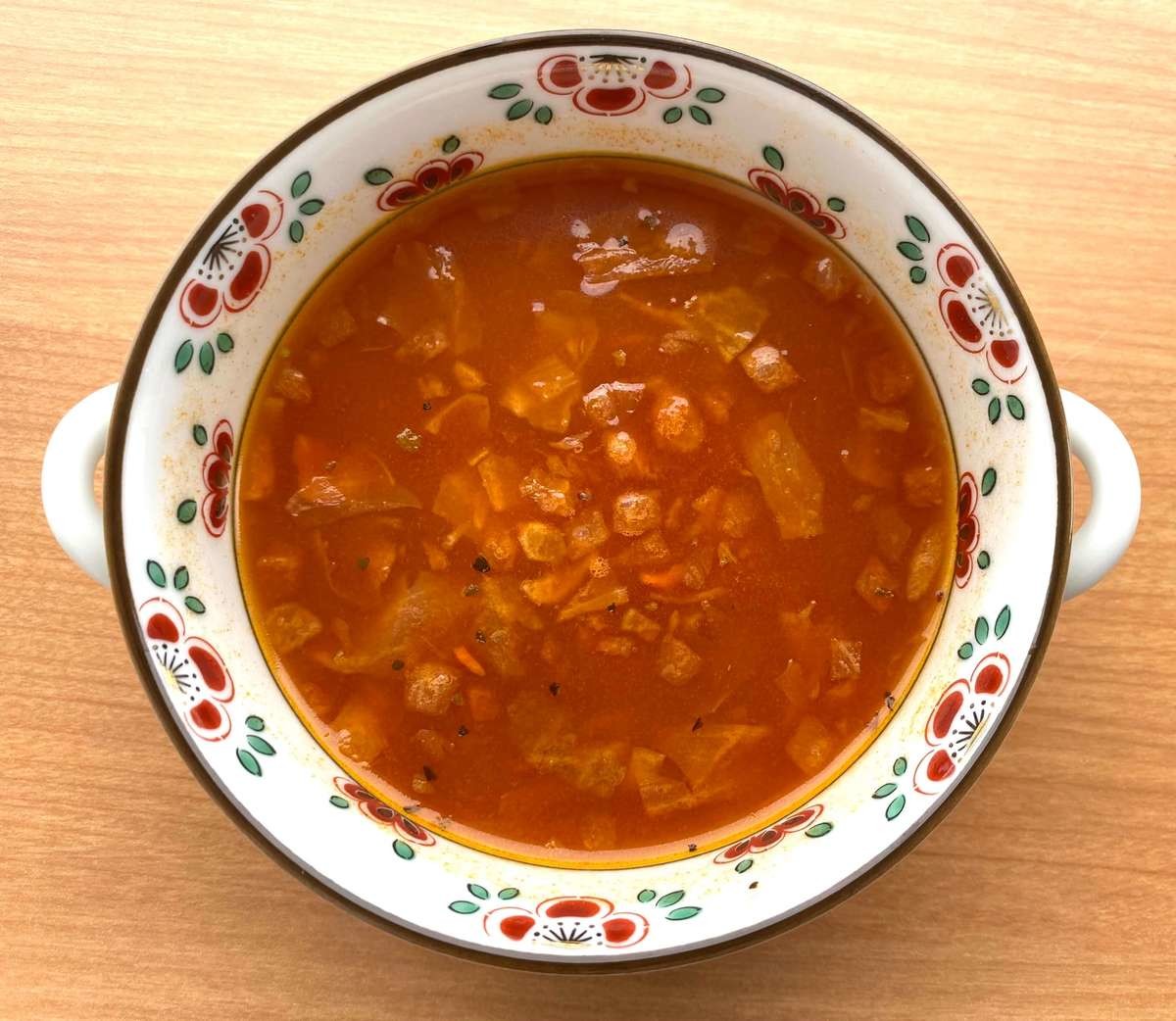 キャベツや玉ねぎ、人参などの5種類の野菜がたくさん入っているので、食べ応え抜群!甘さもありながらトマトの酸味がしっかり効いていて、まるで手作りしたミネストローネのようです。