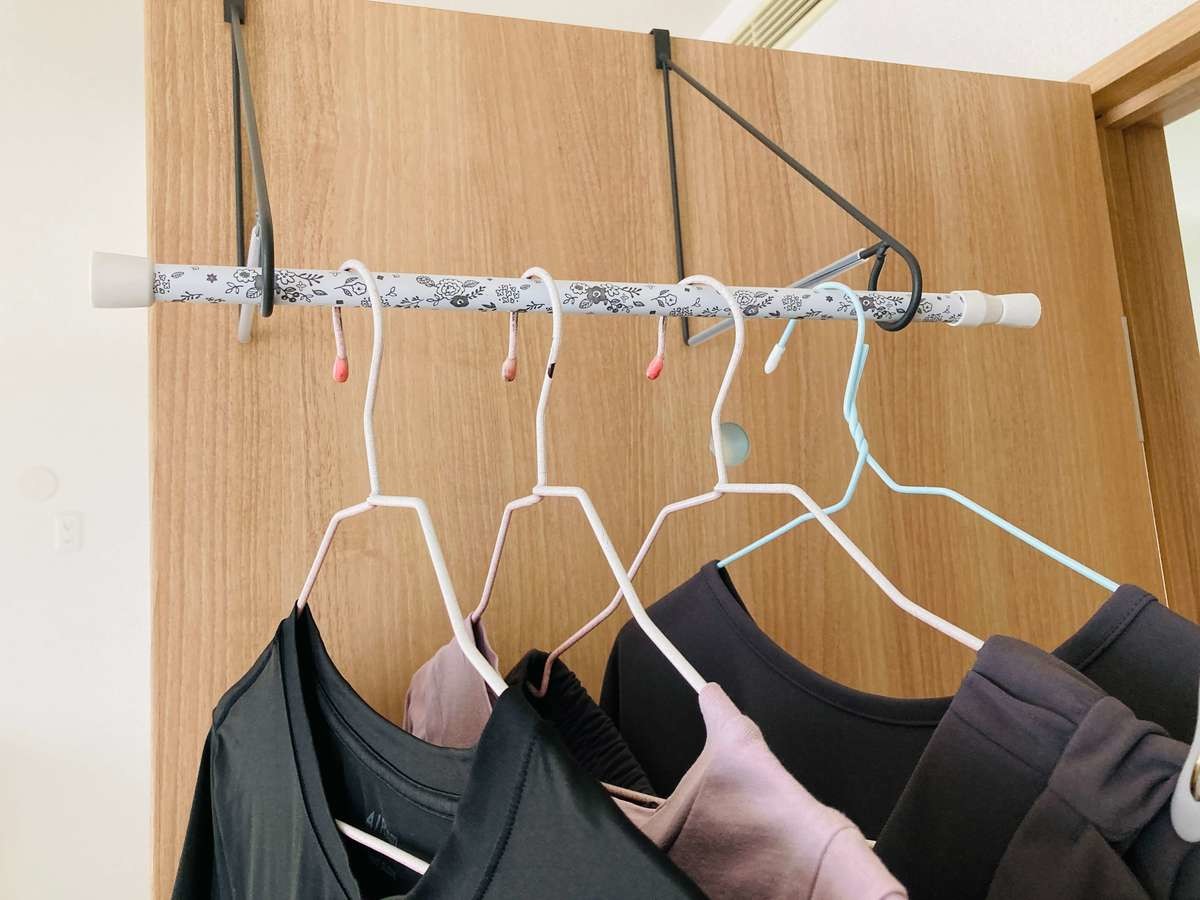 2つ目は、ドアフックハンガー2個とつっぱり棒を組み合わせた使い方。つっぱり棒の長さが調節できるので、洗濯物の量に合わせて調節できます。