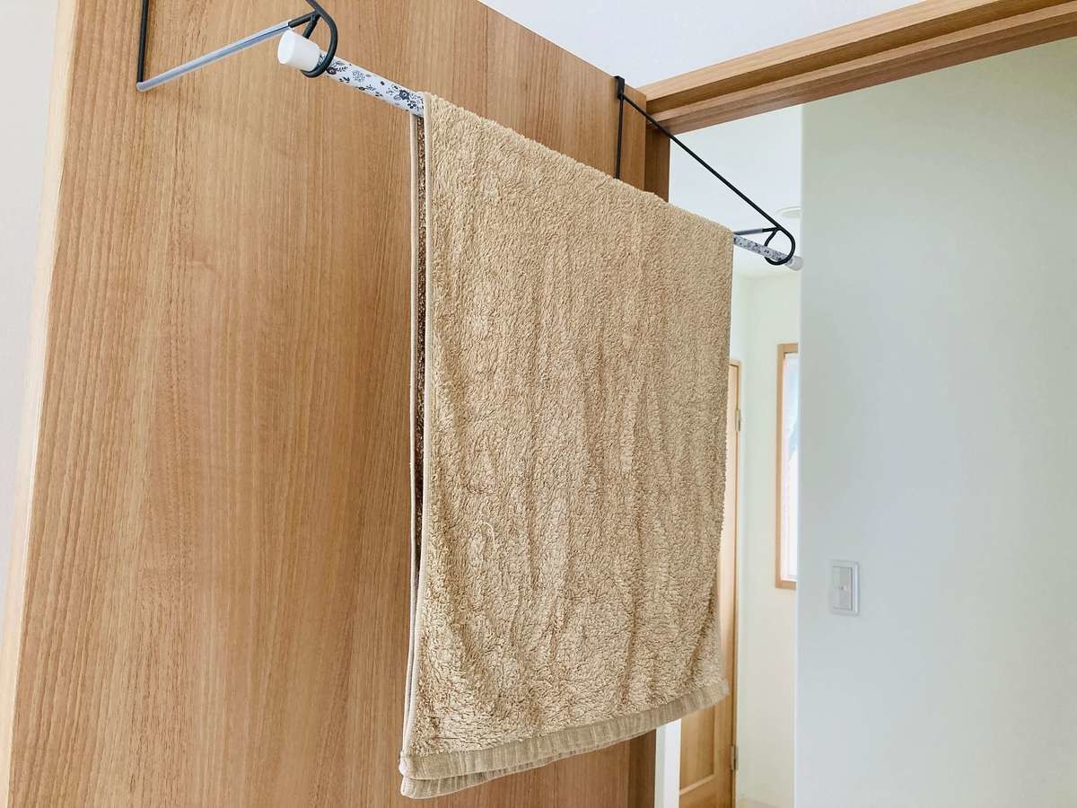 つっぱり棒を最大限まで伸ばして、ドアいっぱいに物干しスペースを作ってみました。バスタオルも余裕です♪