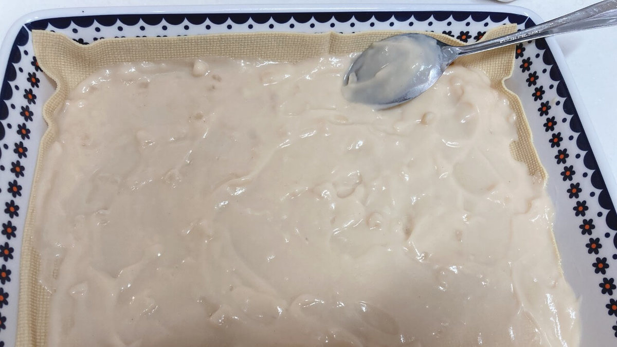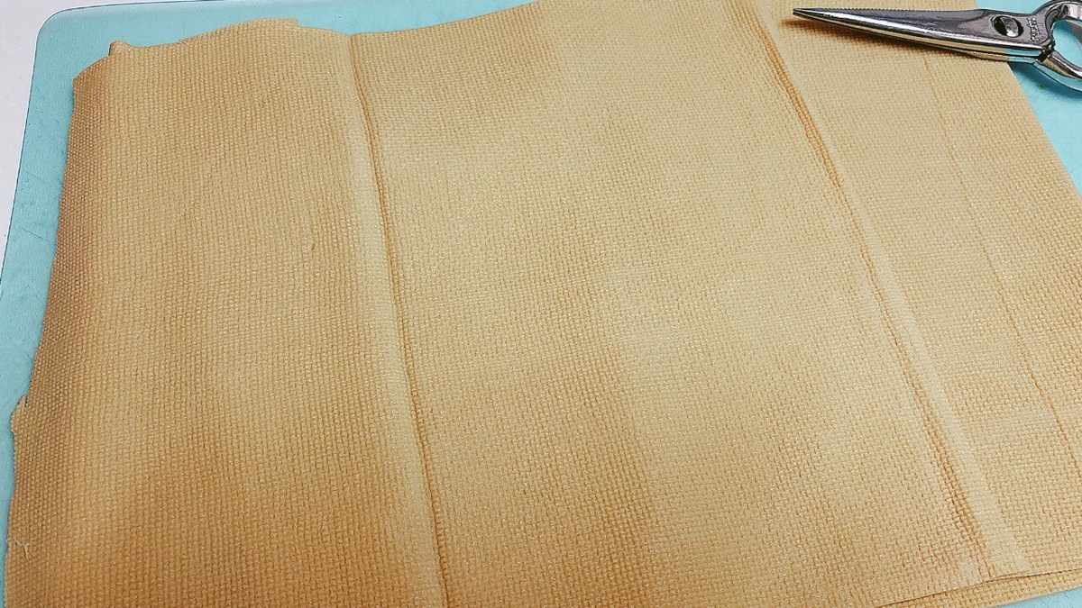 解凍した豆腐皮を取り出し、グラタン皿の大きさに合わせて切ります。豆腐皮は、木綿豆腐の上澄みを水切りし、シート状にしたものって感じです。