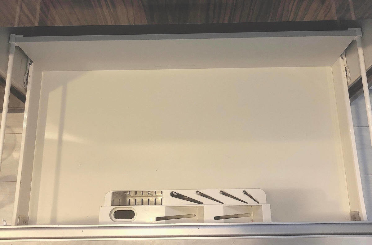 我が家のキッチンの引出し、めいっぱい伸ばしてもまだまだ伸びます!かなり広めのキッチン収納をお持ちの方でも余裕な感じですね!