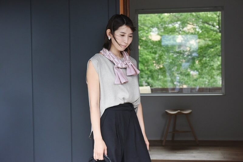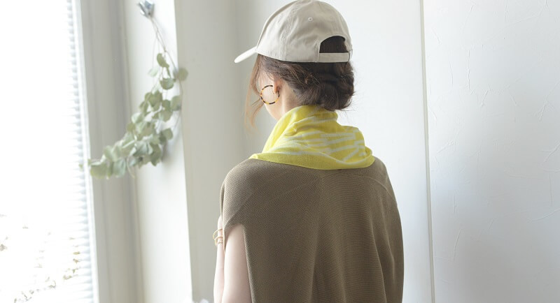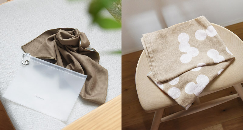 いわゆる「瞬冷タイプの冷却タオル」ですが、よくあるスポーツタイプのものとは違ってファッション性が高く、コーデの一部として取り入れやすいのも魅力です。
