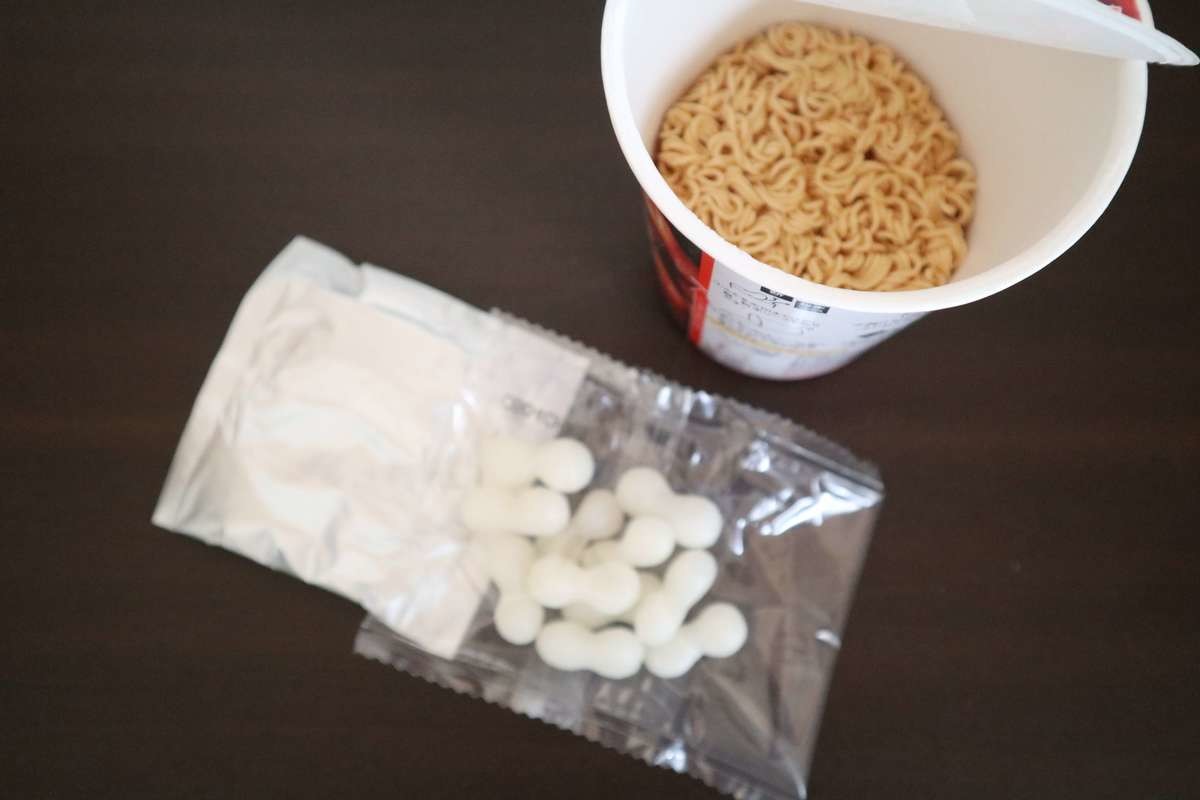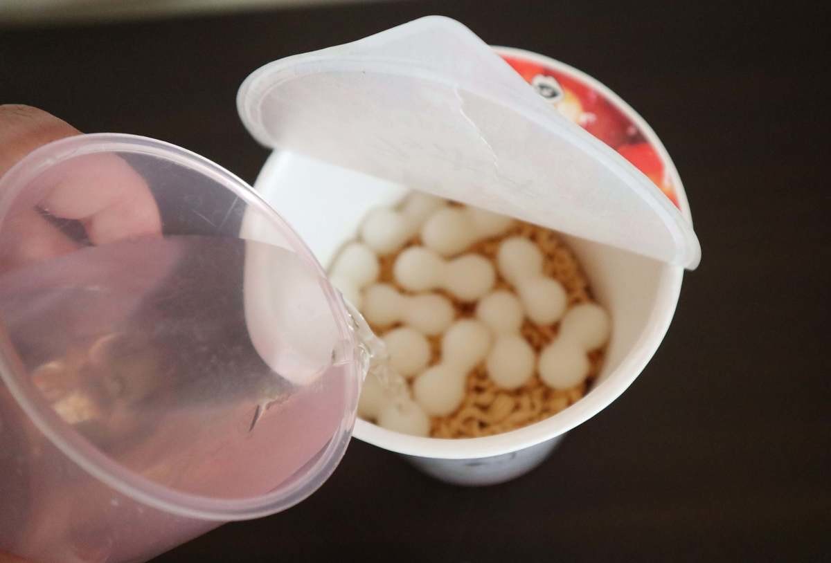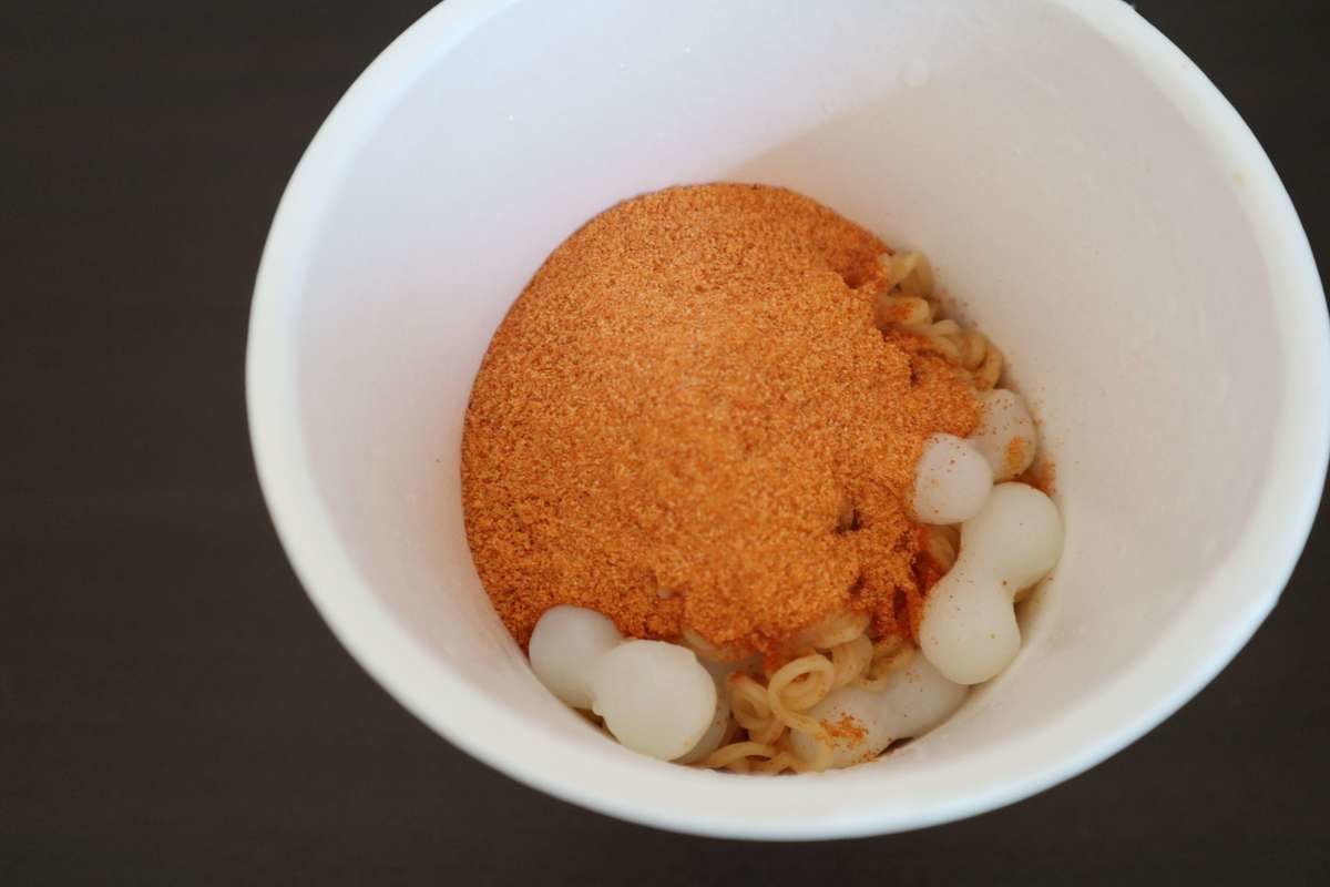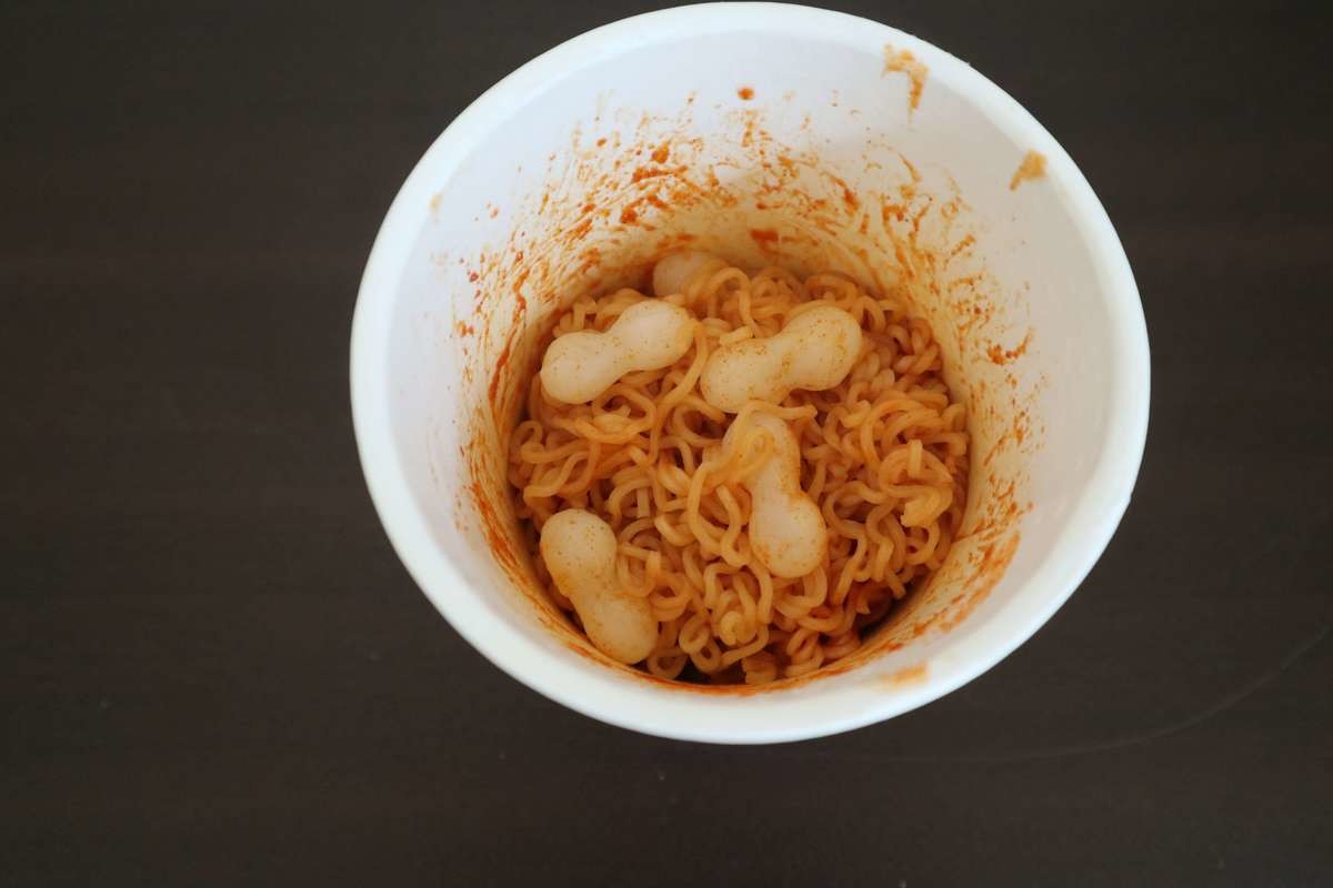 カップにトッポギ、水(トッポギが浸るくらい)を加えて600Wの電子レンジで3分40秒加熱。
