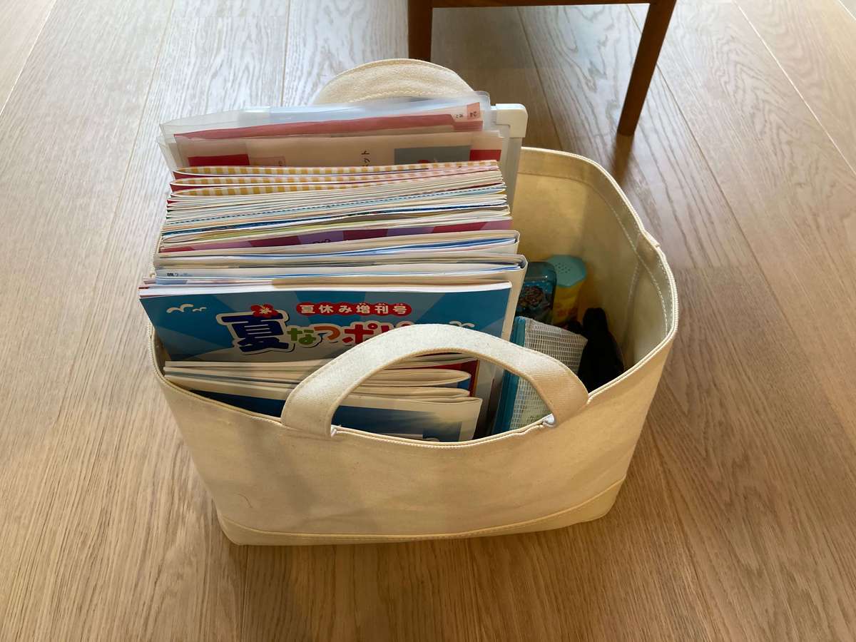 帆布バッグに子ども用の家庭学習グッズを収納したら、一番よく使うローテーブルの横に置くだけ。