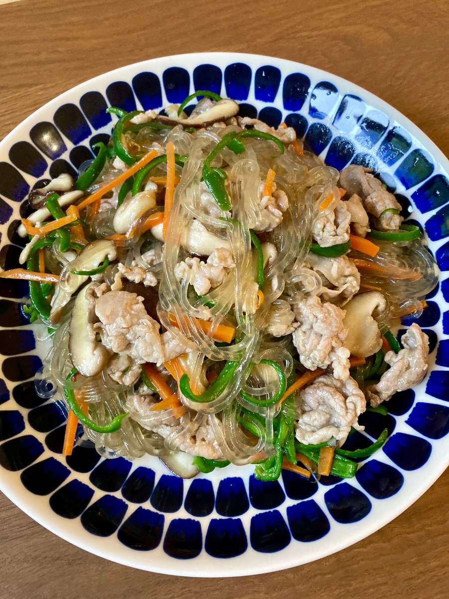 写真は、野菜とはるさめを炒めて、中華だしと醤油、ごま油で味つけしたさっぱり味のチャプチェです。
