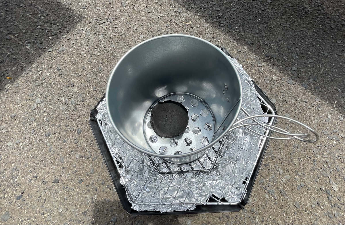 焚き火台に網を敷きその上に火起こし器を置いたら、火起こし器の底に着火剤を入れます。